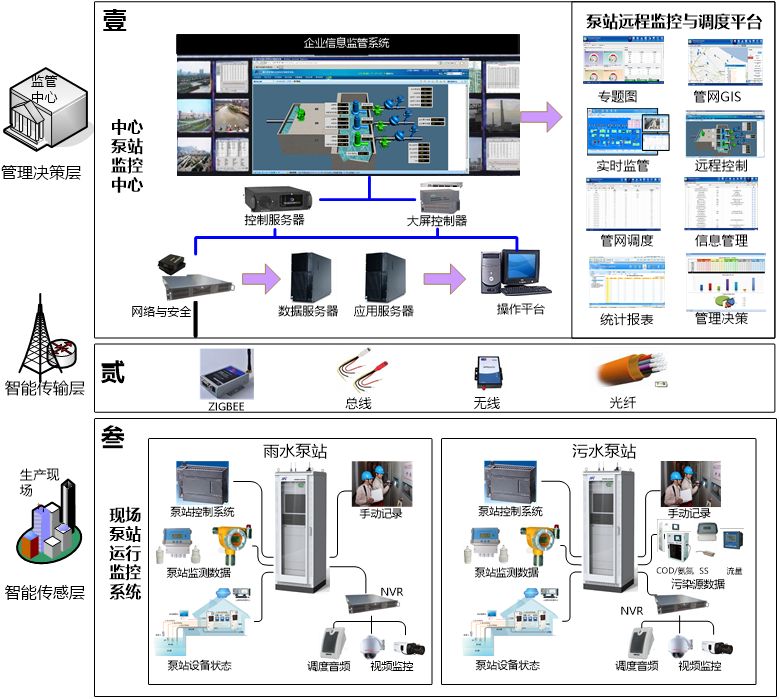管網(wǎng)泵站遠(yuǎn)程監(jiān)控與調(diào)度系統(tǒng)是通過在現(xiàn)場雨水與污水泵站建立自動控制、設(shè)備狀態(tài)監(jiān)控、視頻監(jiān)控、調(diào)度音頻等方面的綜合運(yùn)行監(jiān)控系統(tǒng),并與中心運(yùn)行與調(diào)度平臺實(shí)時對接,實(shí)現(xiàn)泵站運(yùn)行監(jiān)控、遠(yuǎn)程控制、綜合調(diào)度的等功能,為提高管網(wǎng)泵站運(yùn)營管理效率,降低運(yùn)行成本提供確實(shí)可行的科學(xué)手段。